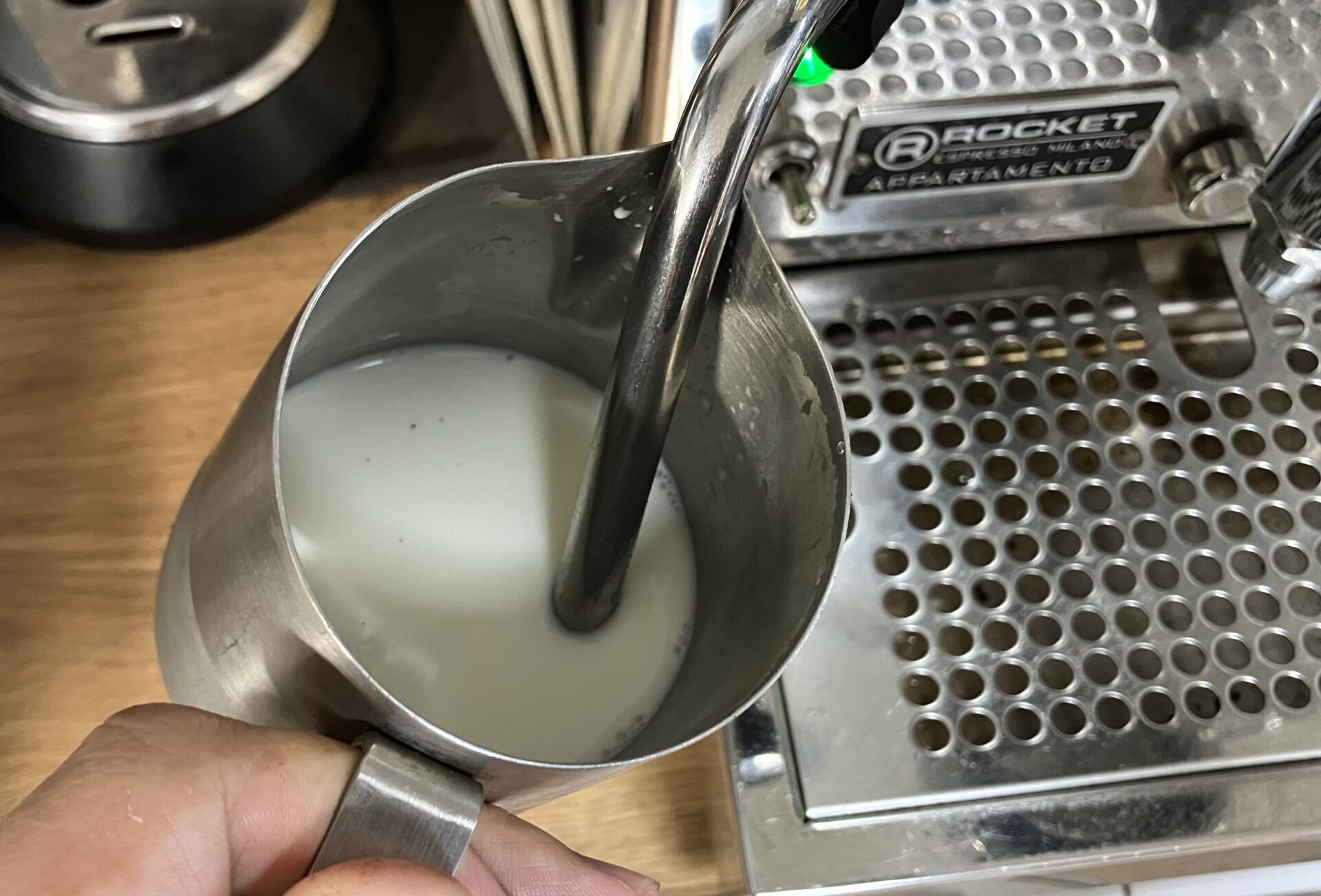 初心者にありがちなのは、ストレッチングをしすぎて撹拌が十分にできず、空気を取り込みすぎたゴワゴワモコモコのスチームミルク「もはやフォームミルク」を作りがちです。