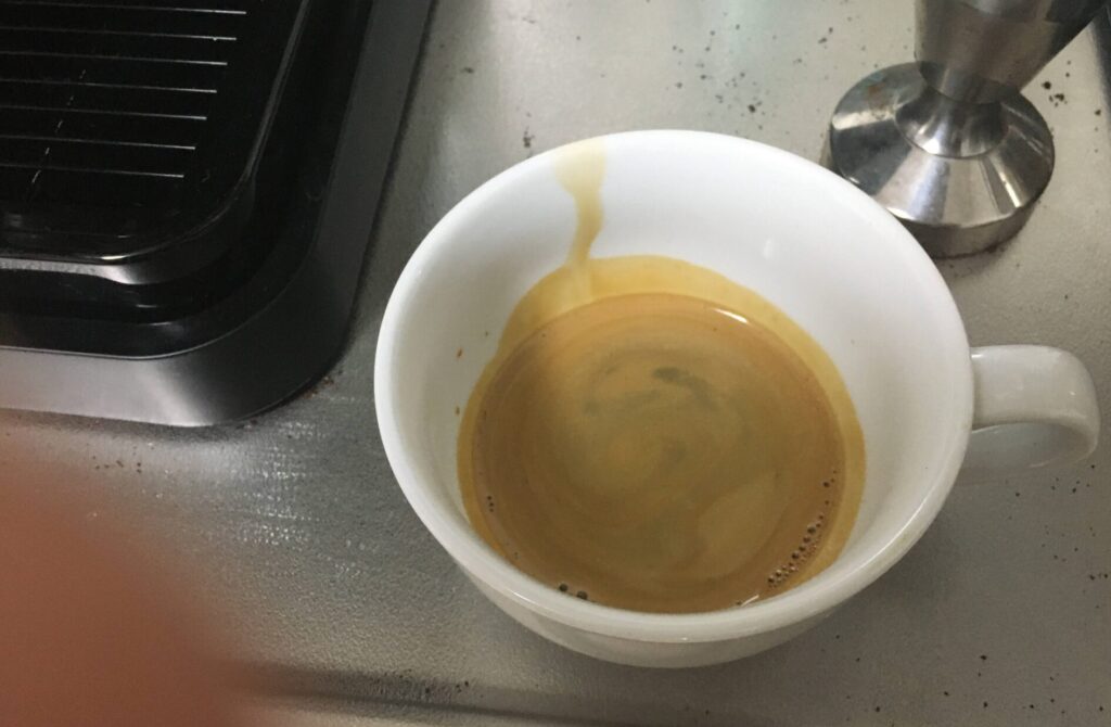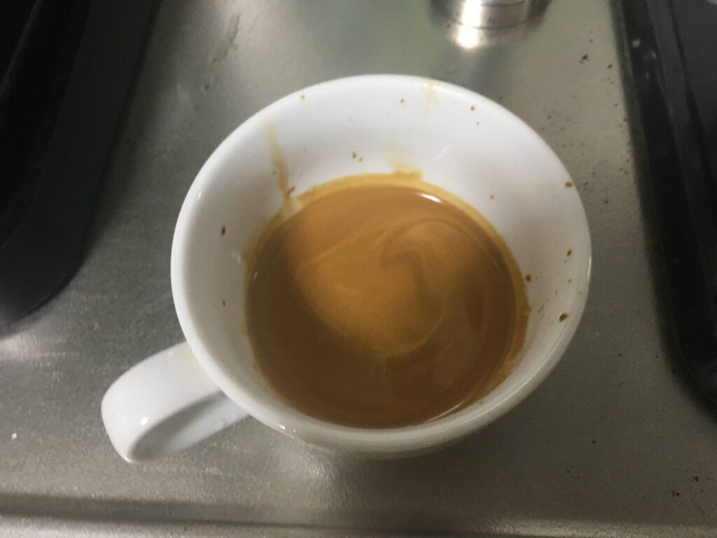 実査に、クレマ増幅弁を使ってエスプレッソを抽出するとこうなります。(使用したコーヒー豆は新鮮で通常ならクレマもりもりとなるはずのものです。)